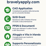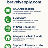 Chi sono Mi chiamo Mattia e attualmente studio ingegneria alla Munster Technological University (MTU) di Cork. Ho affrontato da solo l’intero processo di iscrizione all’università in Irlanda: dalla candidatura tramite la Central Application Office (CAO), all’ottenimento del PPS Number (codice fiscale irlandese), fino alla richiesta e assegnazione della borsa di studio SUSI. Un percorso tutt’altro che semplice, in cui ogni dettaglio conta – perché basta un errore nella documentazione per compromettere l’intero anno accademico.È proprio da questa esperienza che nasce Bravely Apply: un progetto creato per guidare passo dopo passo gli studenti europei che vogliono iscriversi all’università in Irlanda. Collaboro con studenti e laureati del Trinity College di Dublino e dell’University College Cork, per offrire un’assistenza di alto livello a chi è ambizioso, determinato e vuole investire seriamente nel proprio futuro accademico.